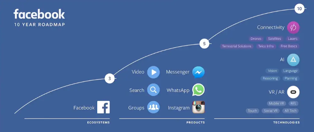 As mentioned before, Meta's long-term strategic goal is to connect the world and bring people closer to each other. To achieve this goal, Meta is constantly planning and iterating its own product plan for the next 5-10 years. In 2016, Zuckerberg gave a 10 year roadmap to substantiate this long-term strategic plan.