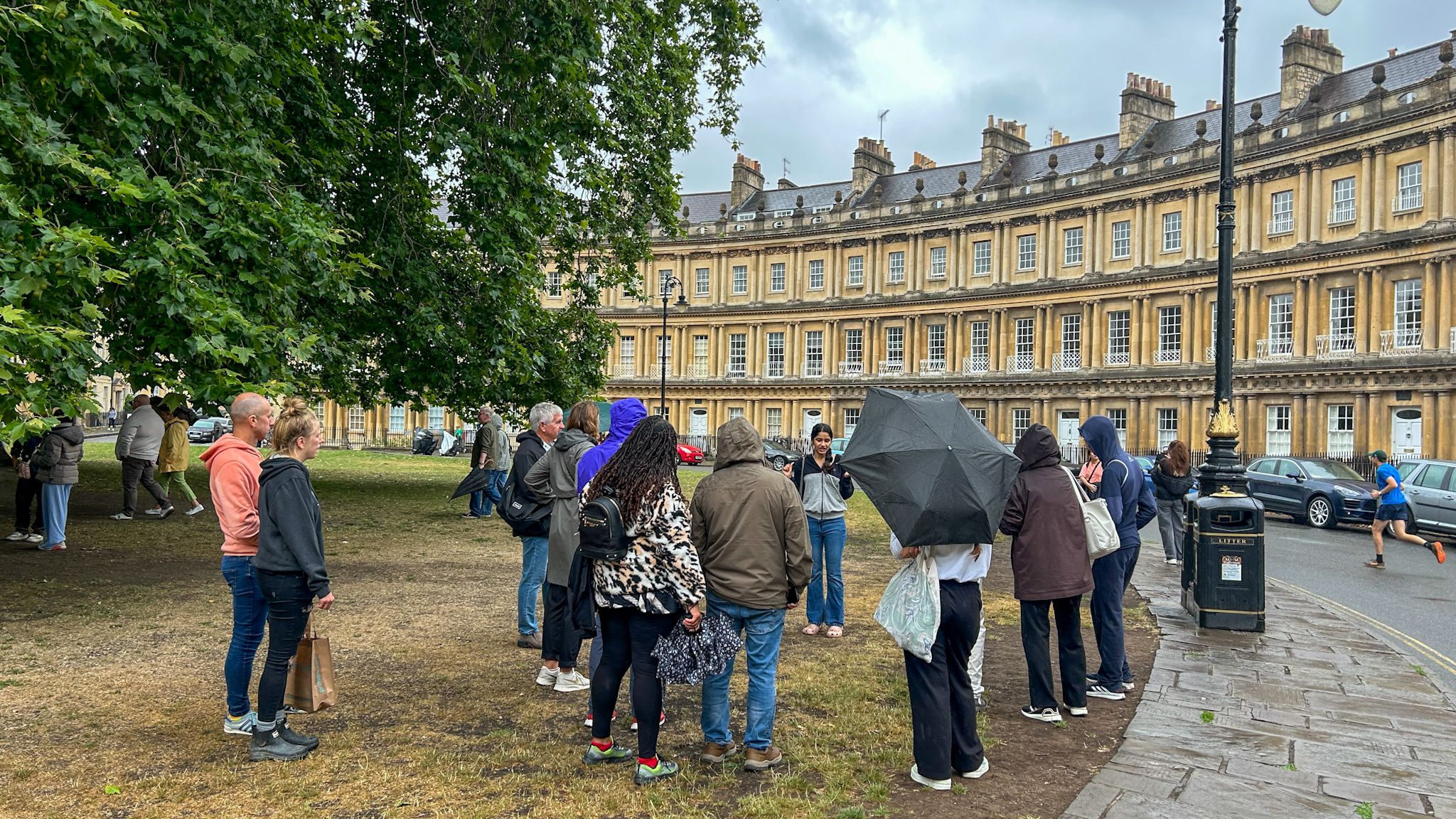A tour group clustered at The Circus, Bath. Image by Sydney Boyd.