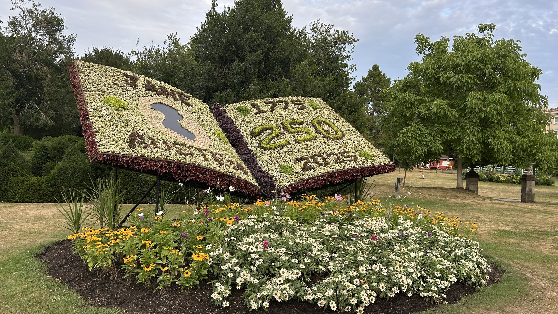 Floral display for Jane Austen's 250th Anniversary in Bath City Parade Gardens. Image by Sydney Boyd