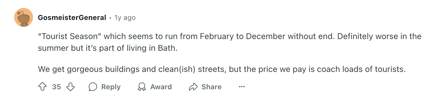 Users on Reddit under the sub “r/Bath” have echoed these concerns. Locals have complained that the city has become overcrowded with tourists, contributing to a lack of affordable housing and inadequate transportation services—familiar complaints in popular tourist destinations across Europe.